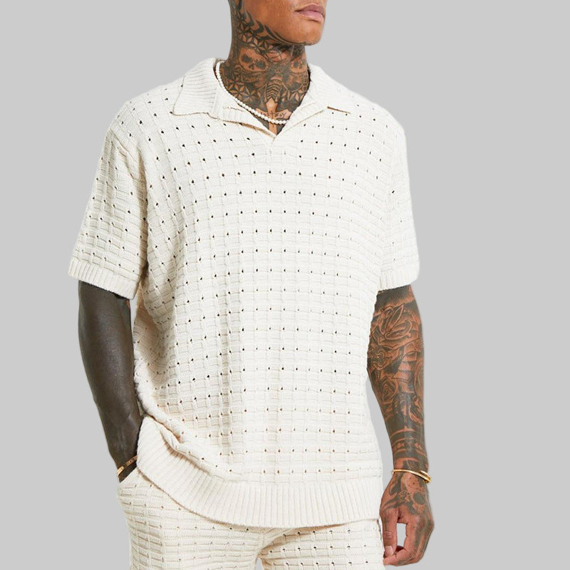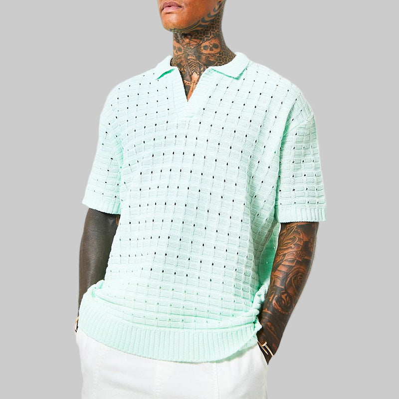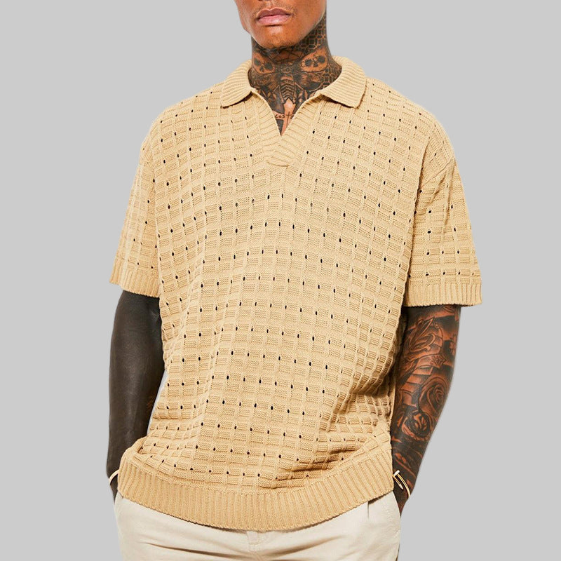 Herenpolo met korte mouwen en V-hals. De mouwen en onderkant zijn voorzien van geribde boorden. Het oppervlak heeft een opengewerkt patroon.