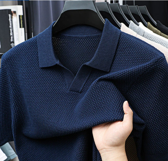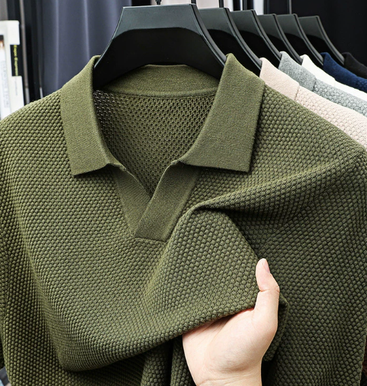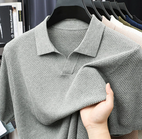 Deze heren polo van katoen heeft een V-hals en korte mouwen. De polo is voorzien van een nette kraag. Het oppervlak heeft een fijn structuurpatroon over het hele kledingstuk.