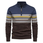 Heren trui met lange mouwen en halve ritssluiting. Voorzien van een opstaande kraag en een jacquard geweven ontwerp op de borst. Het onderste gedeelte en de mouwen hebben een gebreid kabelpatroon.