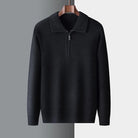 Deze heren trui heeft lange mouwen en een halve ritssluiting aan de voorkant. De trui is voorzien van een brede kraag en geribde boorden aan de mouwen en onderkant. De structuur van het breisel is egaal over het hele oppervlak. De trui is gemaakt van acryl en nylon.