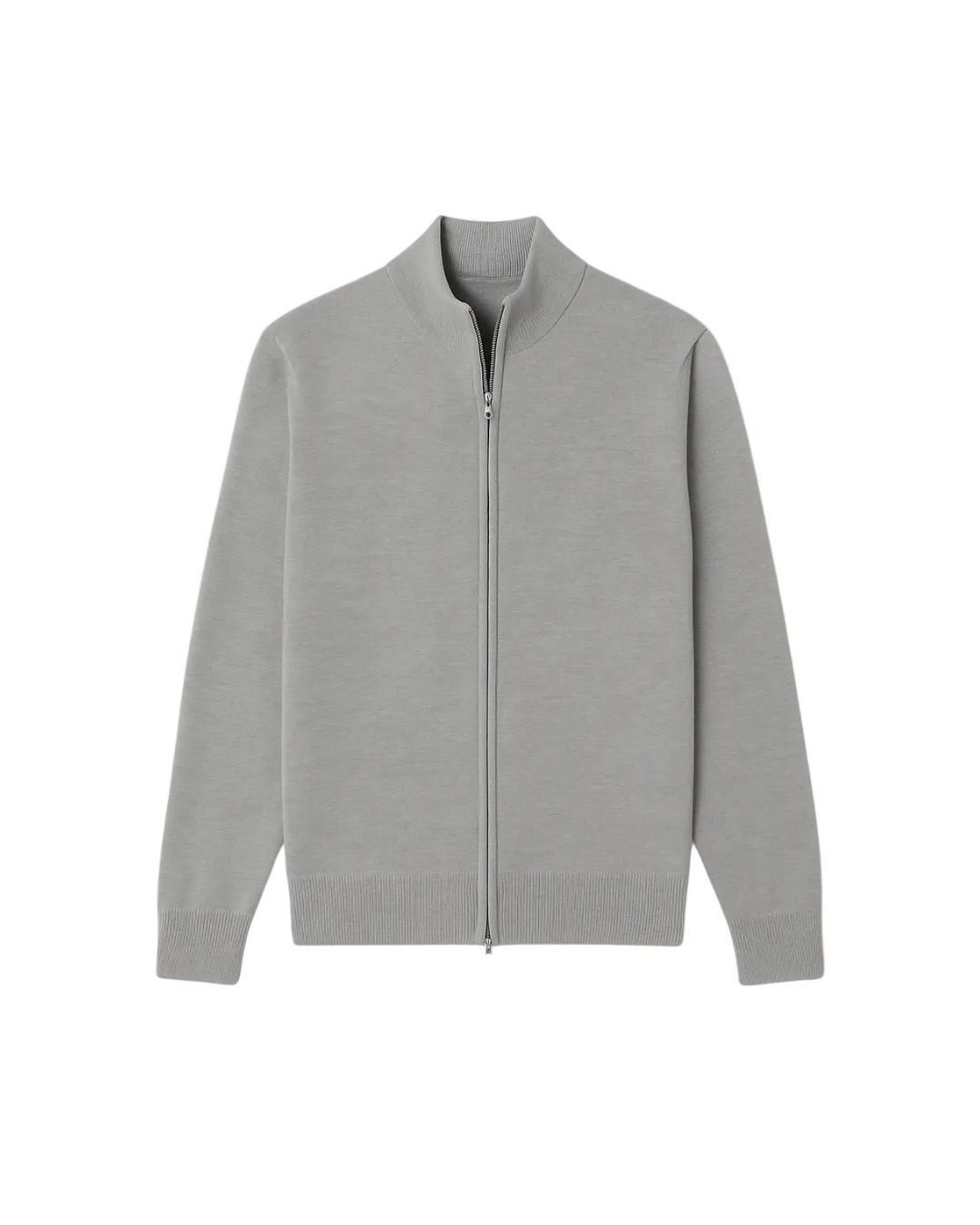 Heren vest met lange mouwen en een ritssluiting aan de voorzijde. Het vest heeft een ingewerkte kraag en een rechte zoom. De manchetten en zoom zijn voorzien van ribboordafwerking. Het ontwerp is effen uitgevoerd.