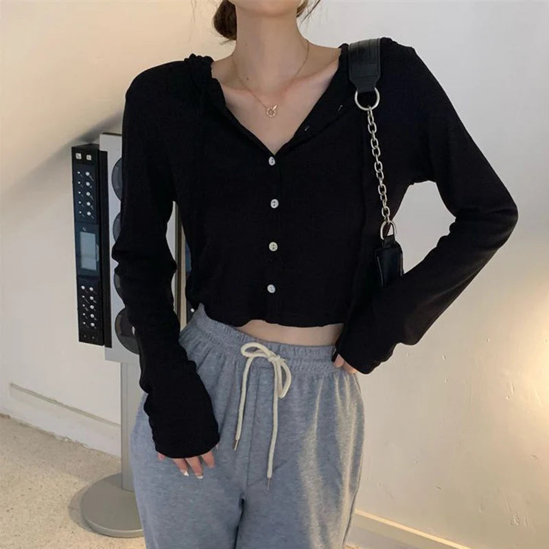 Dames vest met lange mouwen en een capuchon. Het vest is kort en voorzien van een knoopsluiting. De capuchon heeft een aantrekkoord voor een verstelbare pasvorm.