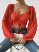 Dames top met lange mouwen en een diepe V-hals. Voorzien van een striksluiting en plooidetail. De mouwen zijn licht transparant en hebben een elastische afwerking bij de polsen.